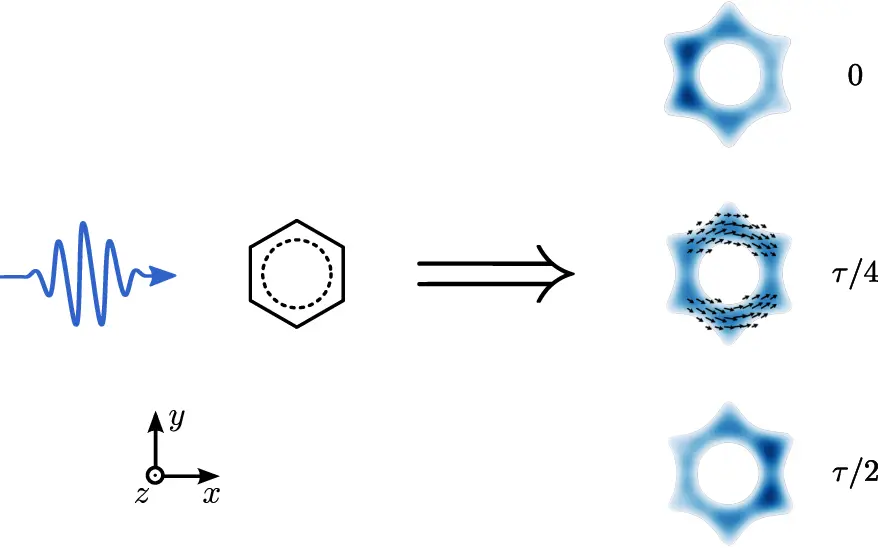 Snapshot of moving electrons in a benzene molecule